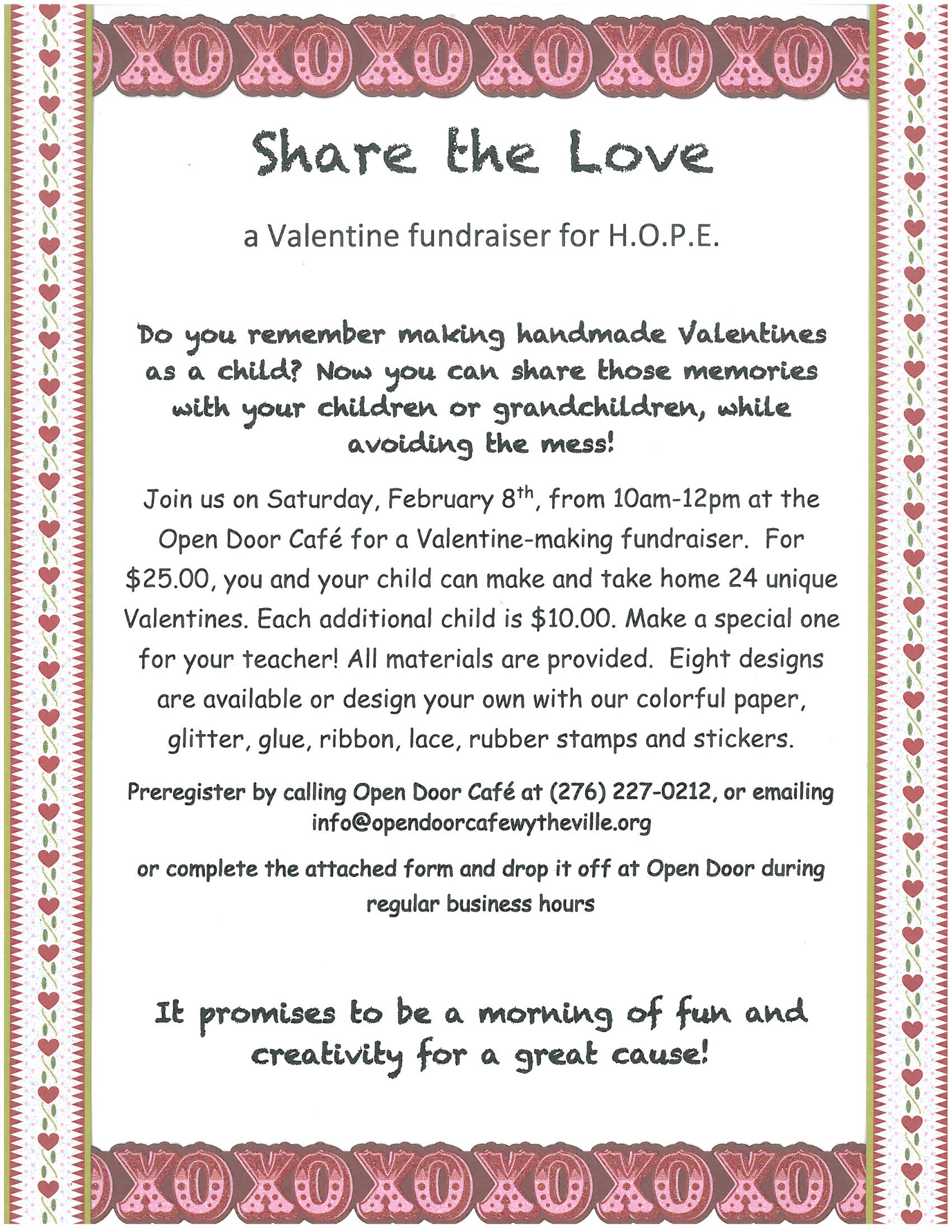 Register Now! February 8th 10 am - 12 pm Share the Love: A Valentine Fundraiser for HOPE | |